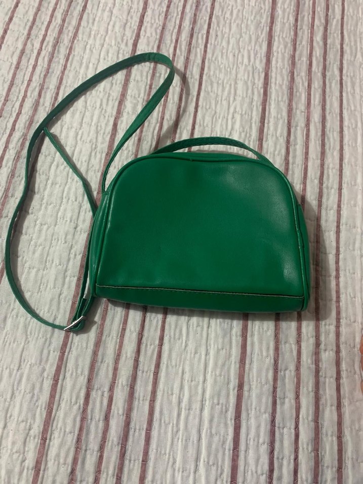 Koyu yeşil deri çapraz çanta, fermuarlı ve minimalist tasarıma sahip, günlük kullanıma uygun bohem ve retro tarzda.
