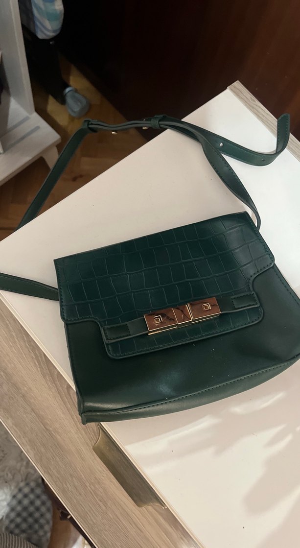 Koyu yeşil deri, tokalı kapaklı ve hafif yılan derisi desenli kadın omuz çantası, trend günlük tarz için uygundur. Marka temsili