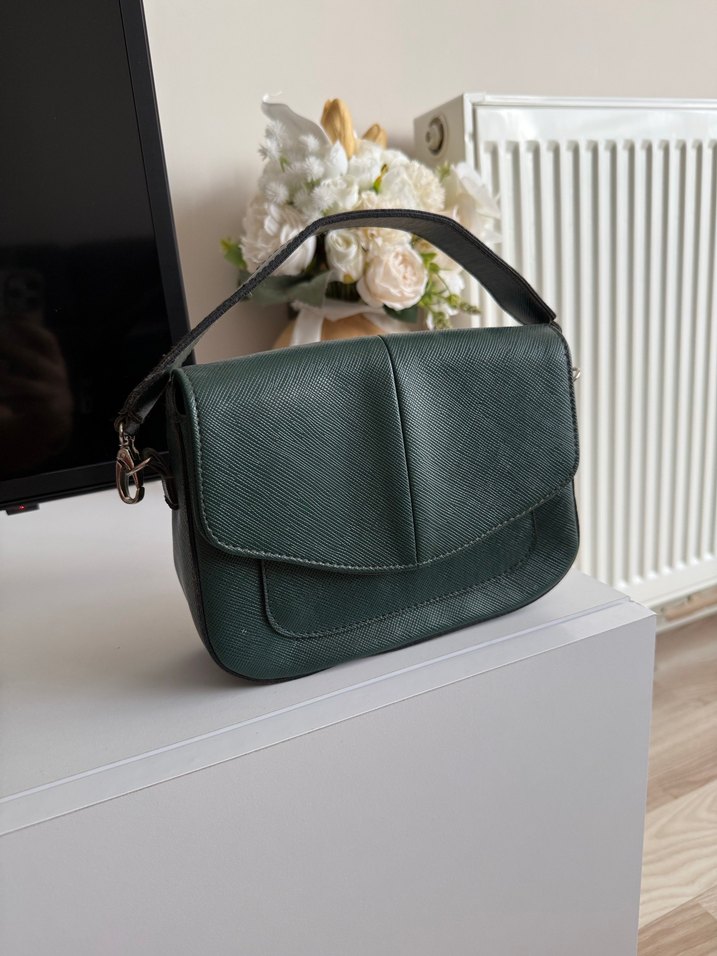 Deri ve tokalı, modern klasik tarzda koyu yeşil kadın çanta. Düz yüzeyi ve şık tasarımıyla günlük kullanıma uygundur.