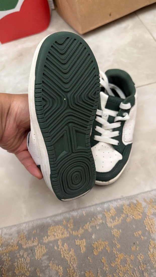 Koyu yeşil desenli, bağcıklı ve kauçuk tabanlı erkek çocuk spor ayakkabısı, trend sokak stili için uygundur. Temiz kullanılmıştır