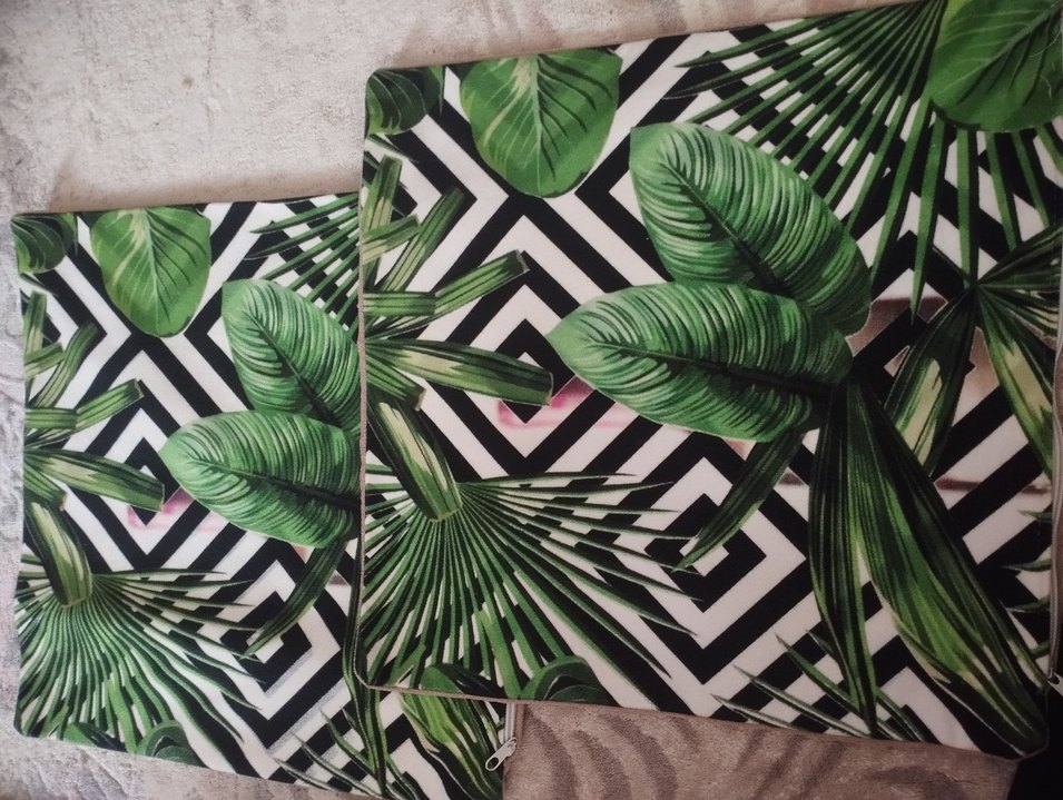 Koyu yeşil yaprak desenleri ve siyah-beyaz geometrik arka planıyla modern baskılı kırlent kılıfı.