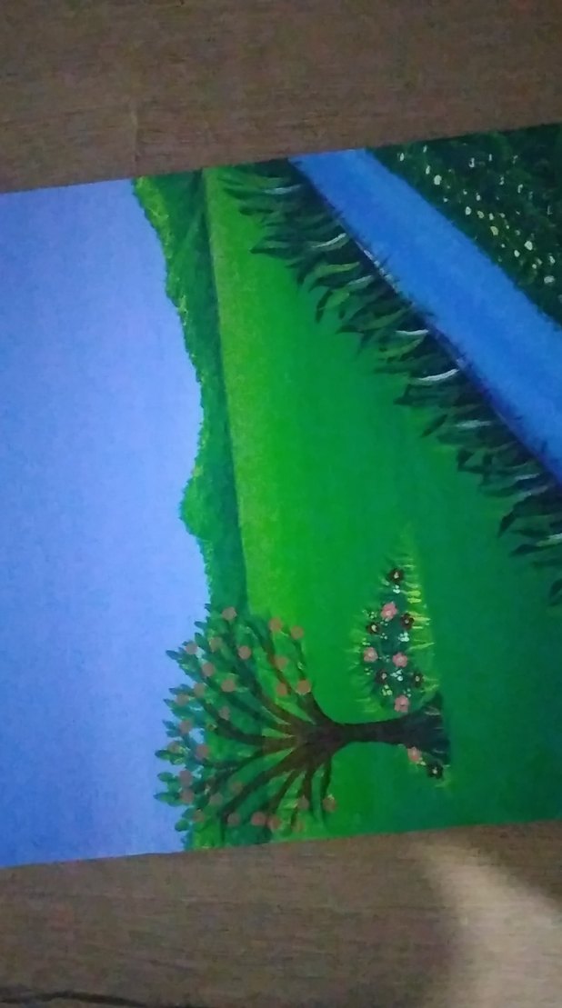 Bu tablo koyu yeşil bir doğa manzarası, ağaç, çiçekler ve mavi gökyüzü içerir. Sahne huzurlu ve canlıdır.