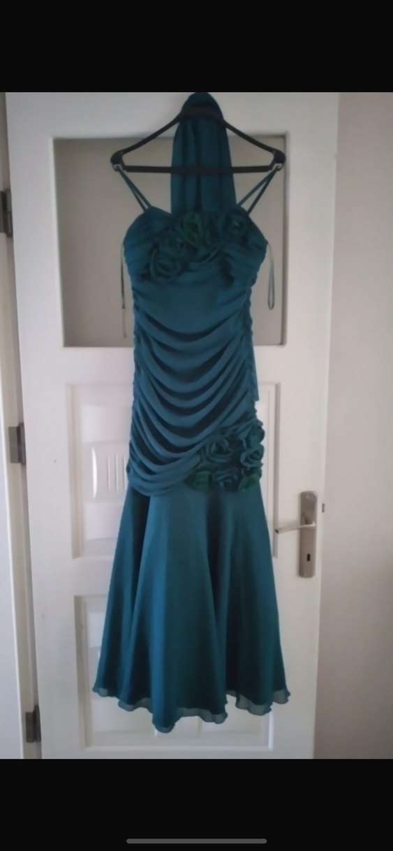 Drapeli ve çiçek detaylı,ip askılı ve vücuda oturan bu uzun abiye elbise, koyu yeşil renkte olup düğün ve çağdaş tarzlar için uygundur. Sadece 1 kez kullandım