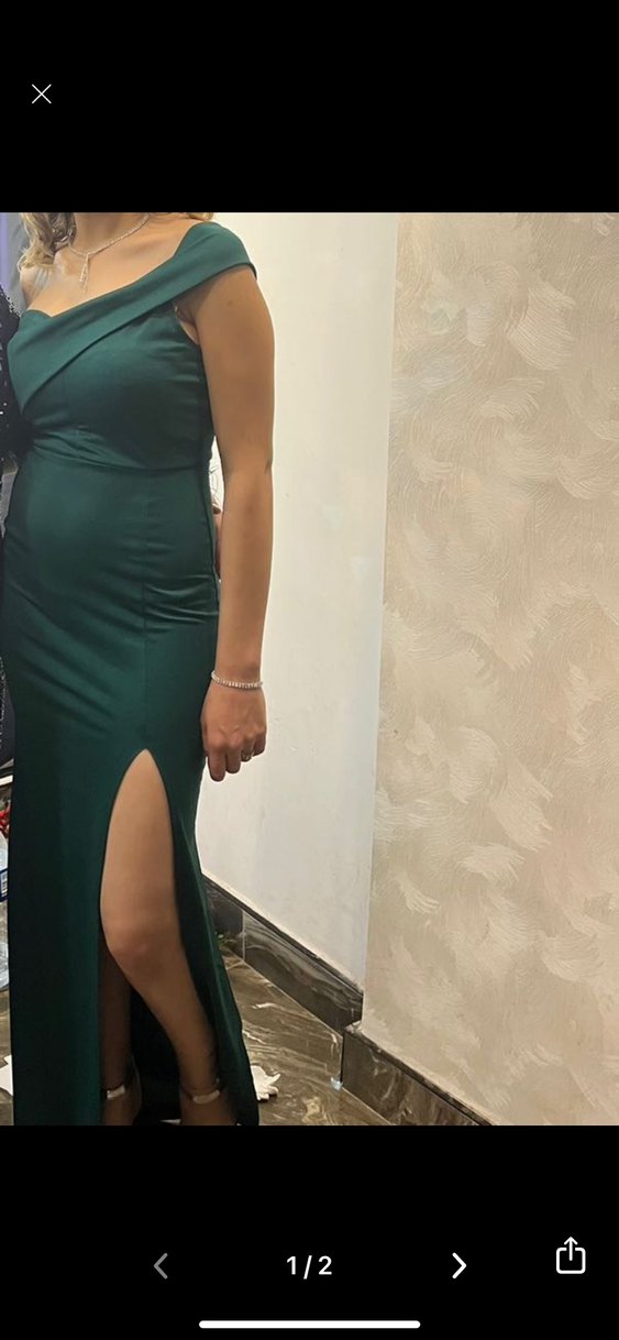 V yaka, drapeli ve ince askılı, dar kesim uzun abiye elbise. Koyu yeşil rengi ve yırtmaç detayıyla çağdaş bir şıklık sunar. Bileklik geçtiği için çok az ip çıkması var ama giyince belli olmuyor