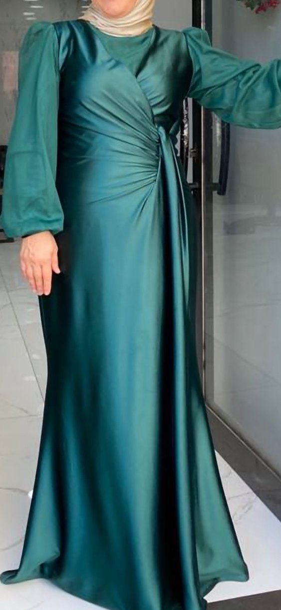 Drapeli tasarımı, V yakası ve uzun kollu kesimiyle fit oturan koyu yeşil uzun abiye elbise. Düğünler için modern klasik şıklık sunar. Kaliteli bir mağaza ürünü Sateni çok iyi ve likralı gibi esnek Yaz düğünlerinde dahi terletmeyen kalitede