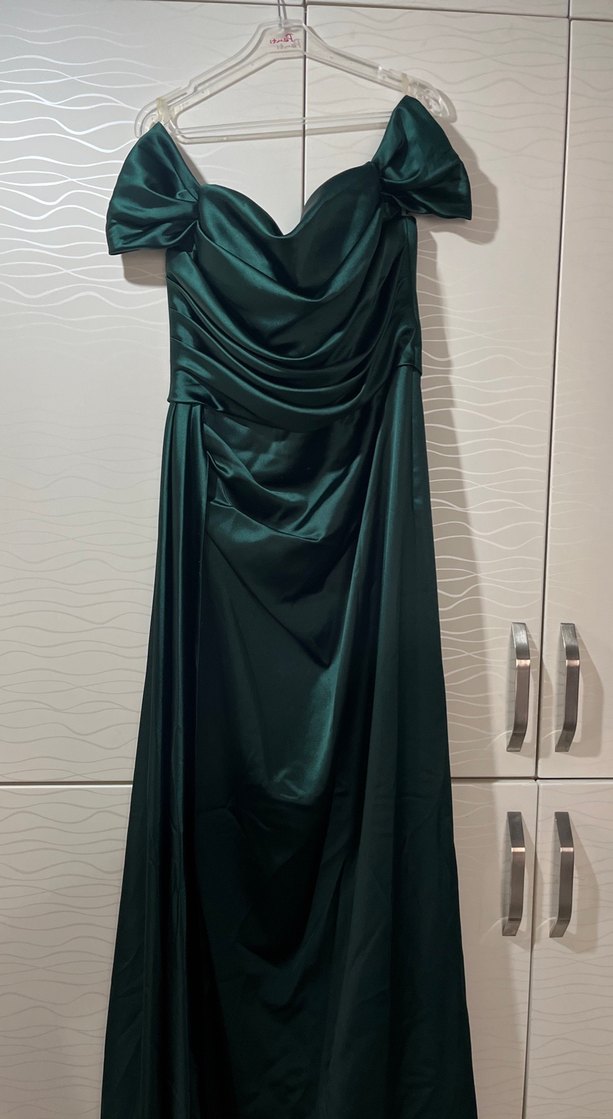 Koyu yeşil renkte, drapeli detaylı, kayık yaka ve dar kesim uzun abiye elbisedir. Kolsuz ve klasik şıklık sunar. Nişan elbisesi için uygundur