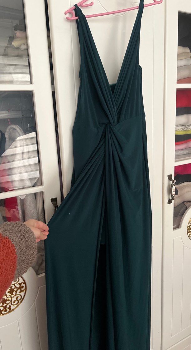 Koyu Yeşil Drapeli Uzun Kadın Elbise abiye tarzı mezuniyet