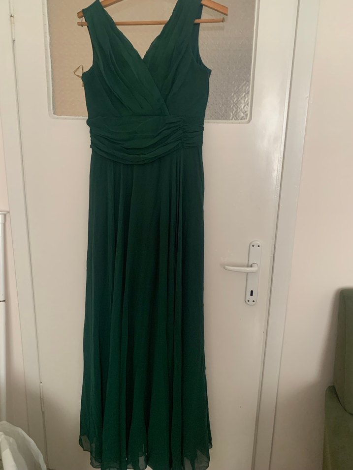 Koyu yeşil renkte, drapeli ve V yakalı uzun, kolsuz, klasik modern tarzda abiye elbise. Düğün için uygun, vücuda oturan kesime sahip.