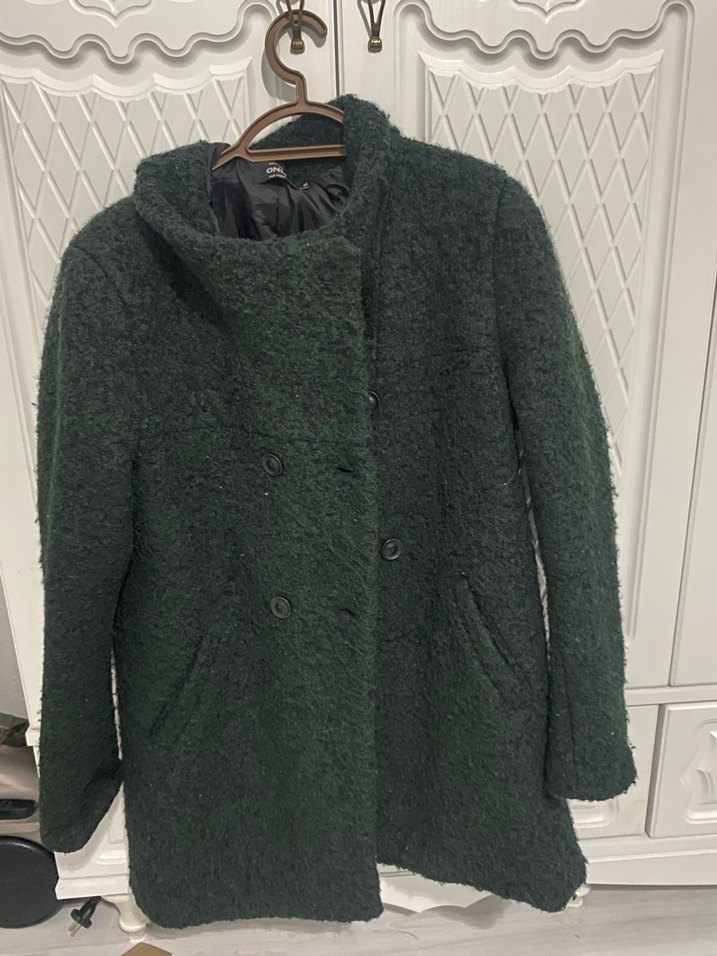 Koyu yeşil renkte, dokulu kumaştan yapılmış, çift sıra düğmeli ve yan cepli kaban.