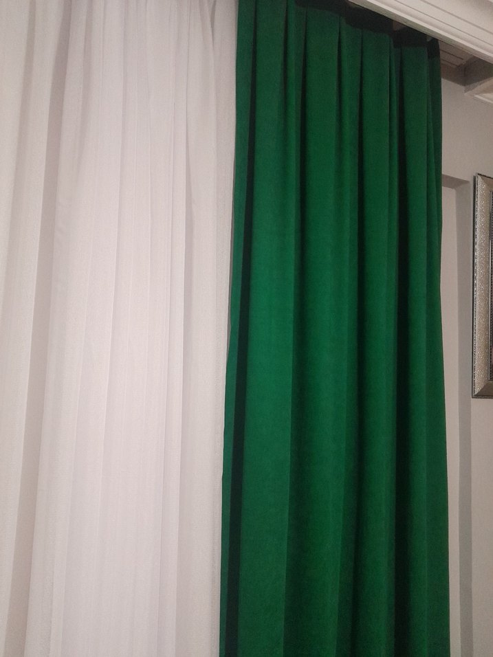 Koyu yeşil, desensiz ve klasik tarzda düz perde, her odaya uyum sağlar.