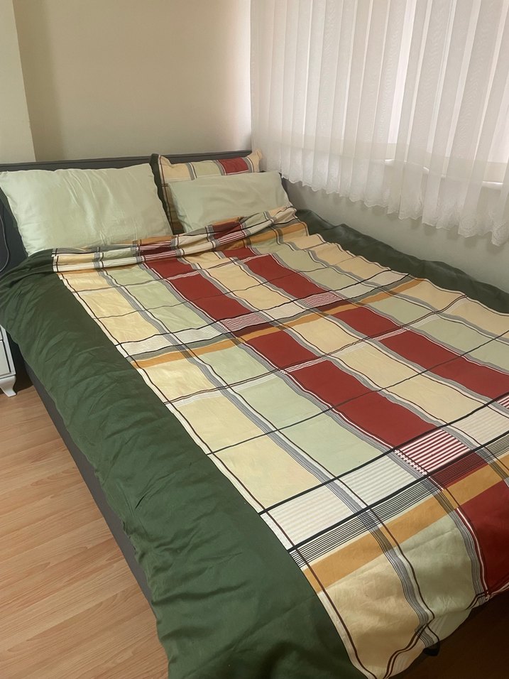 Koyu yeşil kenarlıklı, kırmızı, sarı ve krem renklerinde ekose desenli nevresım ve 4 adet yastık. İki adet oğlanla iki adet sade yeşil ve bir adet nevresimden oluşmaktadır iki yüze 220 cm ölçülerinde sadece çarşafı yoktur %100 pamuk satendir sadece bir kere yıkandı
