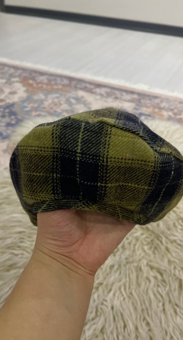 Vintage Koyu yeşil ve siyah ekoseli, rahat dokulu bere şapka, vintage karşı kültür tarzını yansıtır.