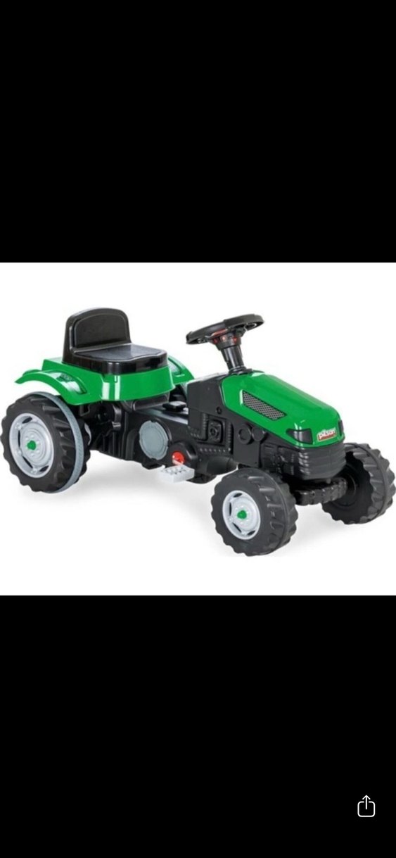Koyu yeşil renkli, rahat oturma yeri ve büyük tekerlekleri olan elektrikli binilebilir traktör. Dış mekan oyunları için uygundur.