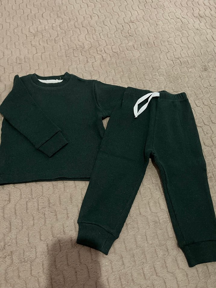 Koyu yeşil renkte, uzun kollu ve bisiklet yaka üst ile uyumlu pantolondan oluşan bebek erkek takımı. Yumuşak ve sıcak kumaştan, sade normcore tarzında.