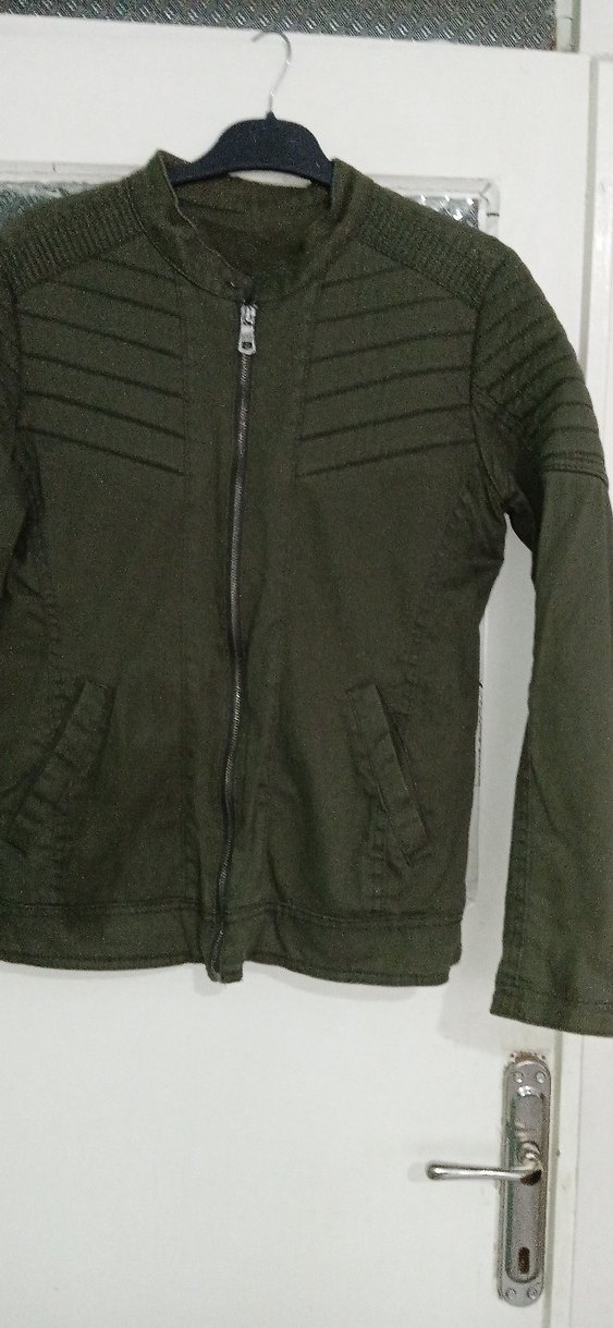 Koyu yeşil renkte, fermuarlı ve kesik yaka detaylı erkek biker ceketi. Uzun kollu, midi boy ve regular fit kesime sahip, sentetik kumaştan üretilmiştir.