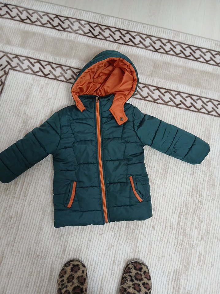 Koyu yeşil, kapüşonlu ve fermuarlı erkek çocuk montu. Turuncu astarlı, dik kesim ve sokak stiline uygun, sıcak tutan dolgulu kumaşla tasarlanmıştır.