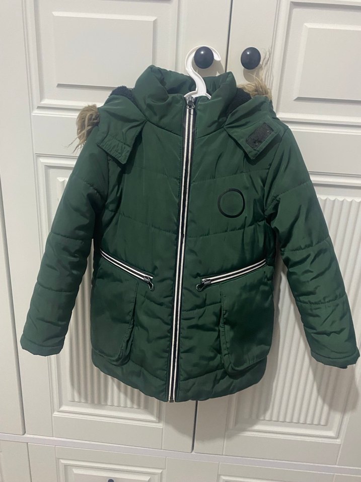 Koyu yeşil, kürklü detaylı, notched lapel yakalı, yumuşak ve sıcak fleece kumaştan erkek çocuk montu.