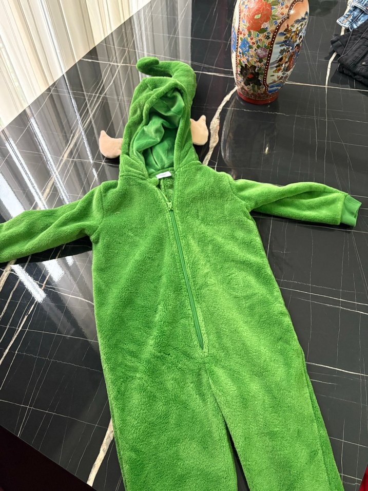 Yumuşak ve sıcak kumaştan yapılmış, koyu yeşil fermuarlı, kulaklı kapüşonlu bebek tulumu.