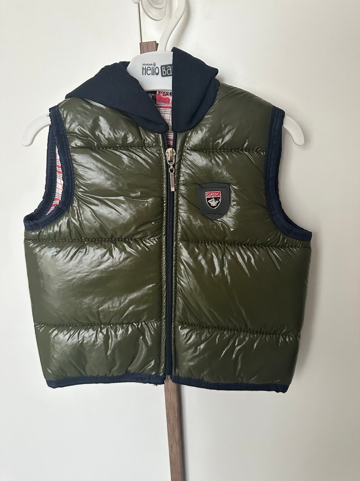 Koyu yeşil renkte, fermuarlı ve kolsuz erkek çocuk yeleği. Notlu yaka ve fitted kesimiyle sokak stiline uygun, yumuşak ve sıcak kumaştan üretilmiştir. 2 yaş yazıyor ama 1den itibaren bebeğin yapısına göre giyilebilir. Hiç giymedi bebeğim temiz üründür. Haki tonlarında kapüşonlu şişme yelek.