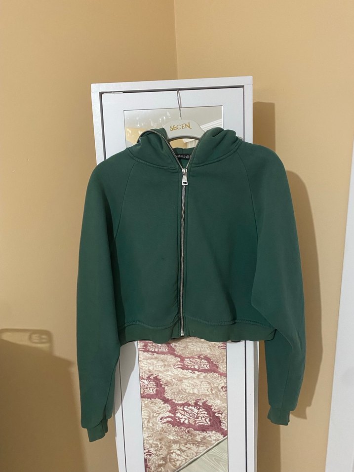 Koyu yeşil, uzun kollu, fermuarlı kadın hırka. Yumuşak ve sıcak dokusu günlük kullanıma uygundur.