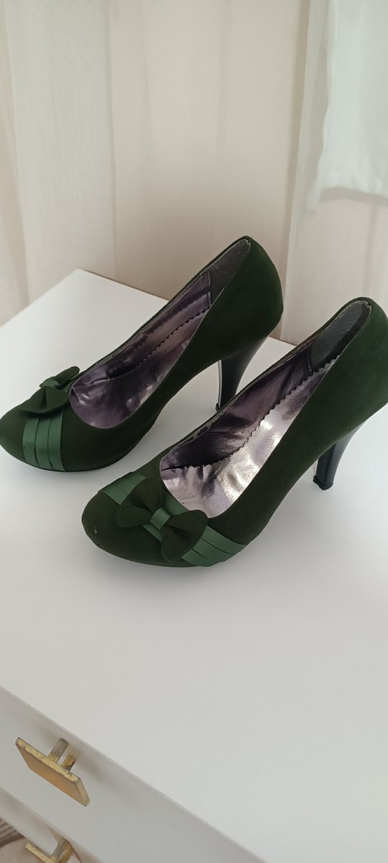 Koyu yeşil platform topuklu kadın ayakkabıları, modern ve klasik tarzı fiyonk detayıyla birleştiriyor. Romantik akşamlar için uygun, dayanıklı kauçuk malzeme kullanılmış.