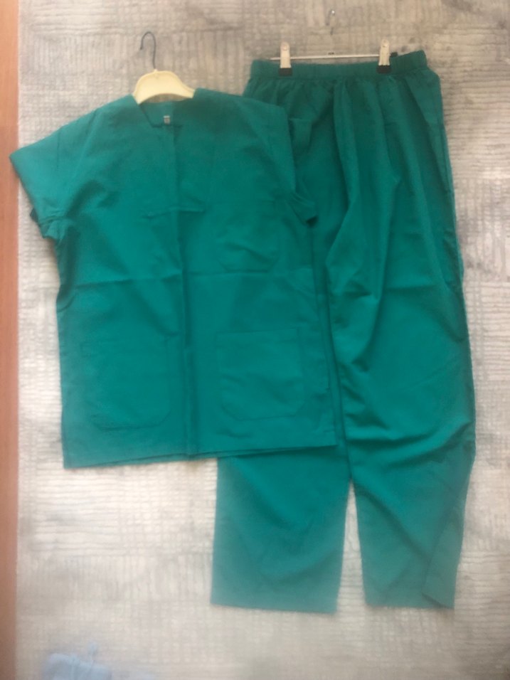 Koyu yeşil, kısa kollu hastane takımı, sentetik kumaştan üretilmiştir. Rahat ve sade tasarıma sahiptir. Ameliyathane kıyafeti sayılı kullanıldı