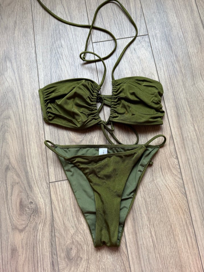Koyu yeşil renkli, ipli ve vücuda oturan kadın bikini takımıdır. Minimalist ve bohem tarzıyla plaj için uygundur.