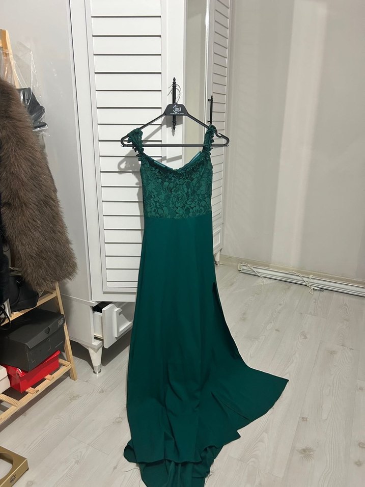 Koyu yeşil, işlemeli, straplez ve ince askılı, drapeli uzun abiye elbise, düğünler için uygundur. Yırtmaçlı