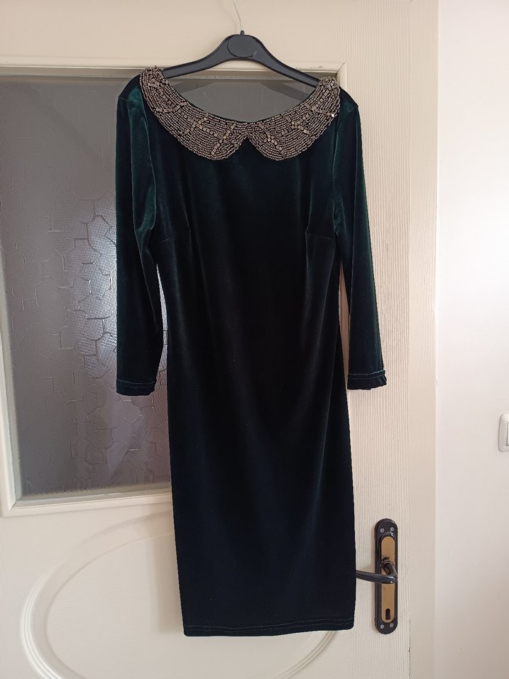 diz üstü, koyu yeşil ve kadife kumaştan, yakası işlemeli ve drapeli, klasik ve gotik tarzda, dar kesim elbise.