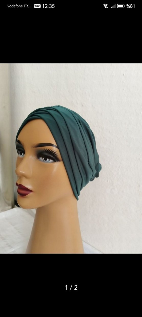 Yumuşak sentetik kumaştan yapılmış, drapeli tasarıma sahip koyu yeşil kadın bone, sade ve mütevazı bir tarz sunar.