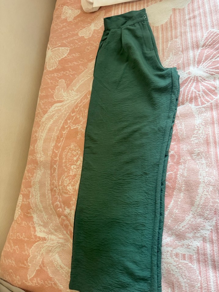 Koyu yeşil, uzun kumaş pantolon, regular fit ve drapeli tasarımıyla minimalist sokak stiline uygun. Günlük kullanıma ideal.