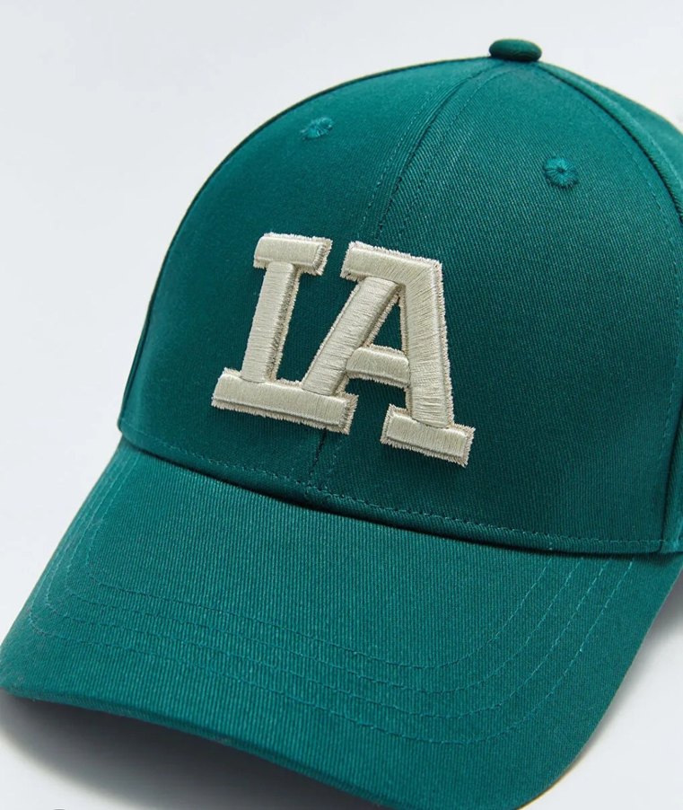 Koyu yeşil kadın spor şapka, IA nakışlı, pürüzsüz sentetik kumaştan üretilmiştir. Rahat ve şık tarzda.