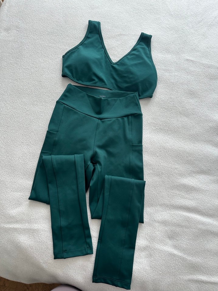 Düz, koyu yeşil kadın taytı, sentetik kumaştan, rahat ve şık görünüme sahip, günlük kullanıma uygun. Alt s beden üst M beden .