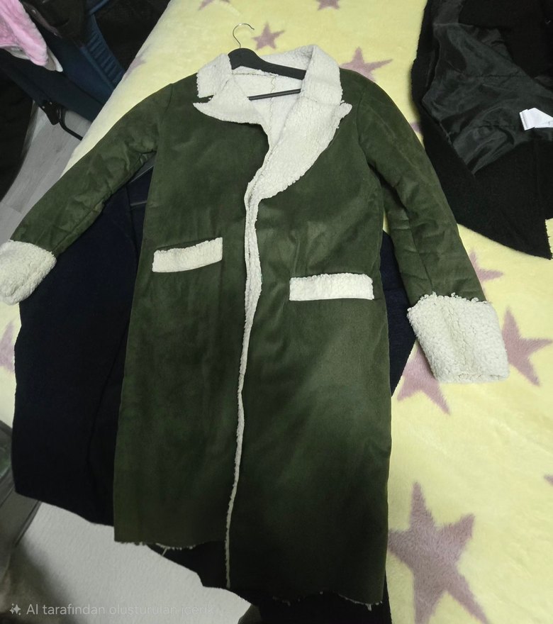 Koyu yeşil renkte, süet kumaştan yapılmış, uzun ve dar kesim kadın ceket. Yaka, manşet ve ceplerde kürk detayları bulunur, rahat ve şık bir sokak stili sunar.