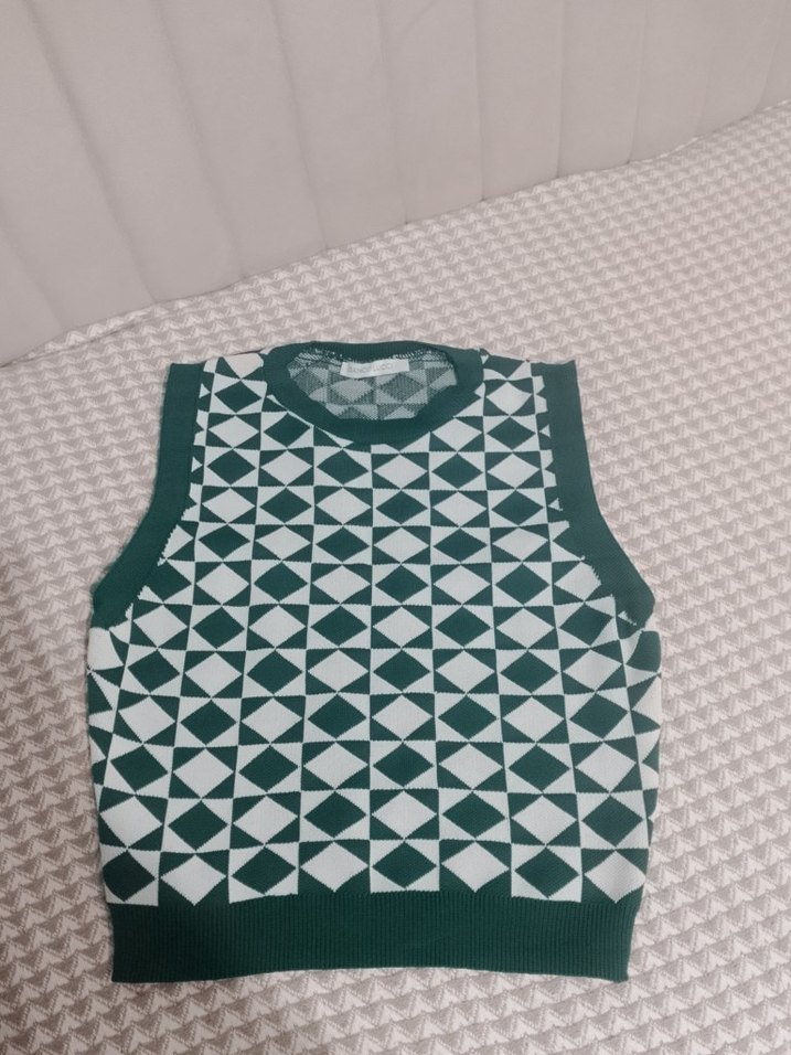 Koyu yeşil renkte, kolsuz, triko örme süveter. Yuvarlak yaka ve düzenli kesimiyle günlük sokak stili için uygundur. Geometrik desenlidir.