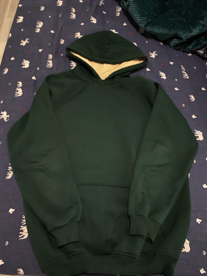 Uzun kollu, kapüşonlu ve rahat kesimli koyu yeşil sweatshirt, yumuşak ve sıcak kumaştan günlük kullanım için uygundur. Kardeşime okul için yaptırmıştık hiç giyilmedi. M/L uyumlu