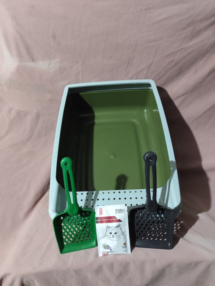 Koyu yeşil renkli kedi tuvalet kabı, beyaz kenarlı, yanında yeşil ve siyah renklerde iki kürek ile küçük bir kedi kumu paketi bulunmaktadır. ürün sıfırdır