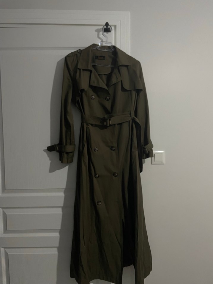 Kahverengi uzun keten trençkot, kemerli ve yakalı, bol kesimle günlük sokak stili için uygundur. Üründe ufak bir kısmında terzi müdahalesi vardır