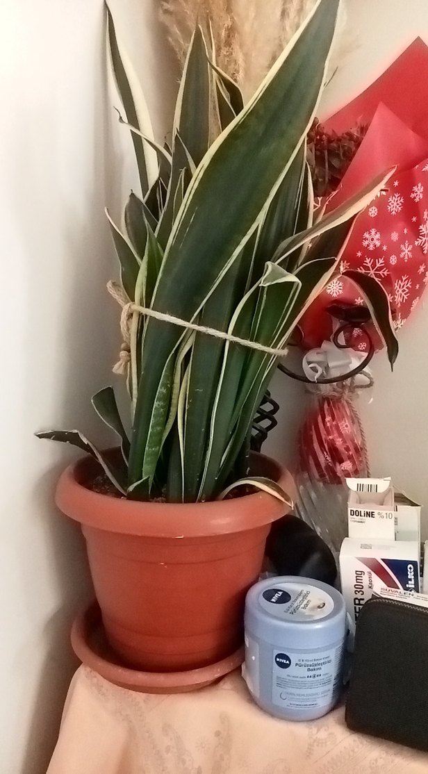 Koyu kırmızı saksıda uzun yapraklı yeşil ev bitkisi bulunmaktadır. Saksının altında aynı renkte bir tabak yer alır.