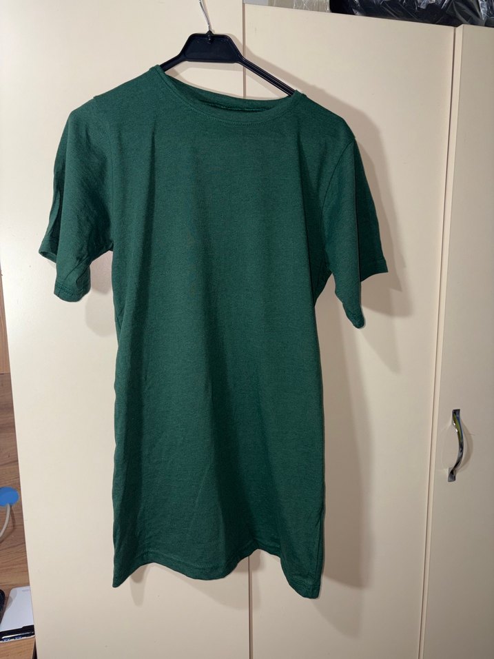 için koyu yeşil keten kumaştan, yuvarlak yaka ve kısa kollu, salaş kesim sade tişört. Günlük kullanıma uygun minimalist tarz.