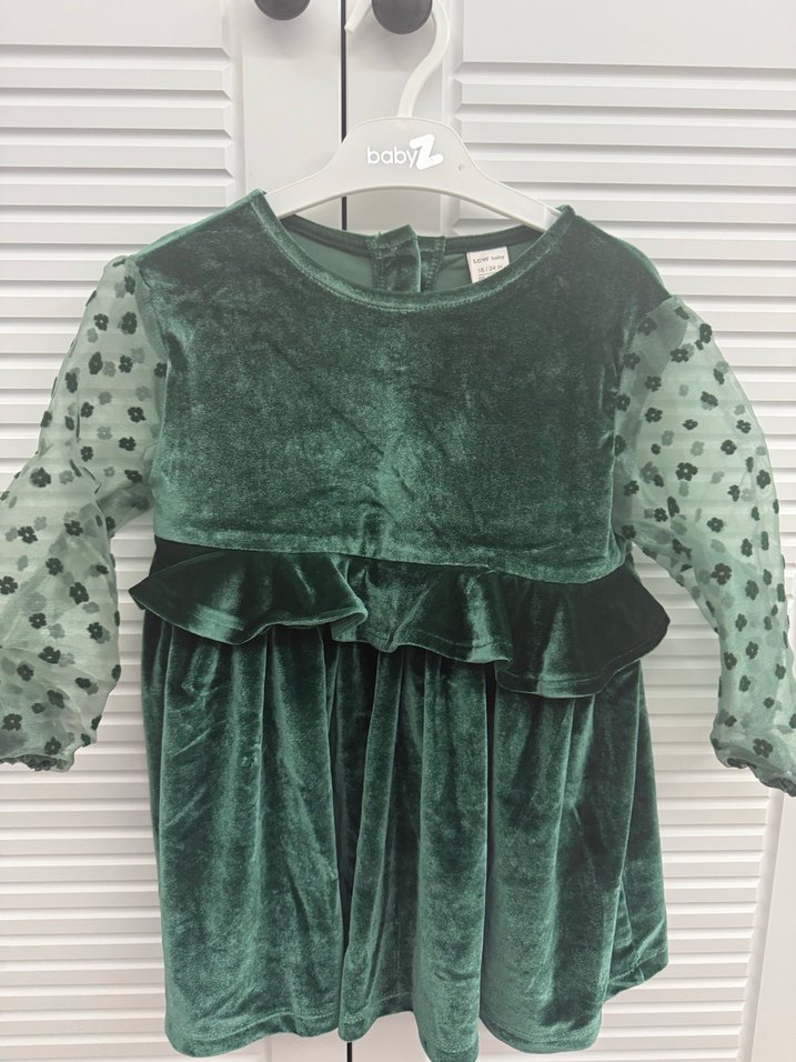 Koyu yeşil renkte, uzun kollu, fırfırlı ve bol kesim kız çocuk elbisesi. Yuvarlak yakalı ve yumuşak, sıcak dokulu kadife kumaştan üretilmiştir. Etiketi kopartılıp, kullanılmamıştır.