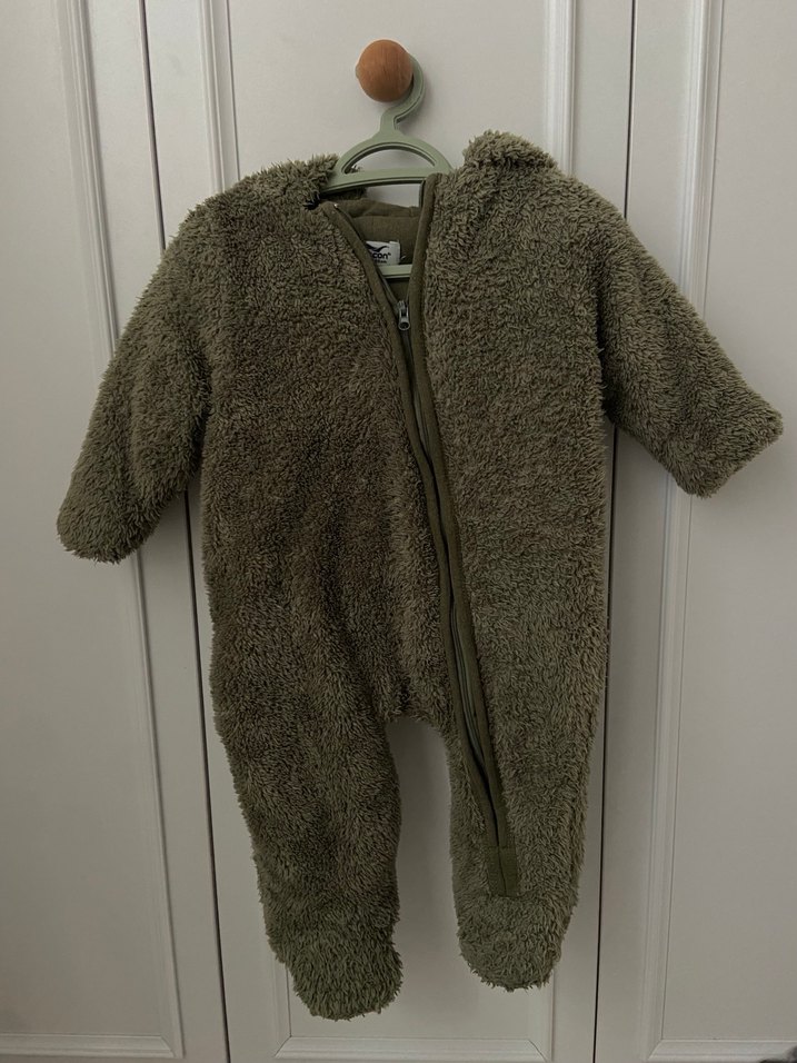 Yeşil, kürk detaylı yumuşak kumaştan yapılmış bebek tulumu. Fermuarlı ve desensiz sade tasarıma sahiptir.