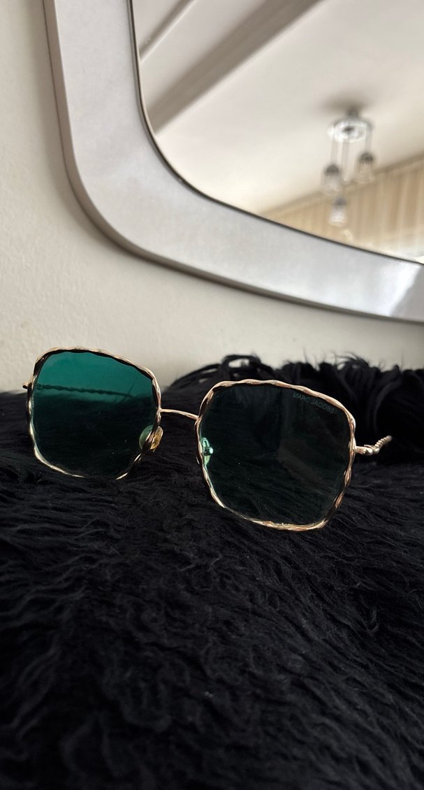 Koyu yeşil camları ve dokulu altın çerçevesiyle kürklü detaylar barındıran bohem retro tarzda kadın güneş gözlüğü.