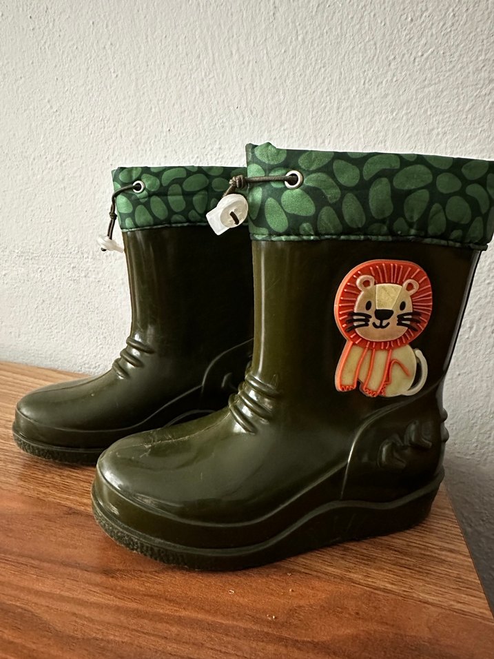Koyu yeşil kauçuk erkek çocuk çizmesi, leopar desenli manşet ve tokalı aslan figürü ile retro ve bohem tarz sunar. Temiz ve az kullanılmıştır. 26-27 bulmaları içindir.