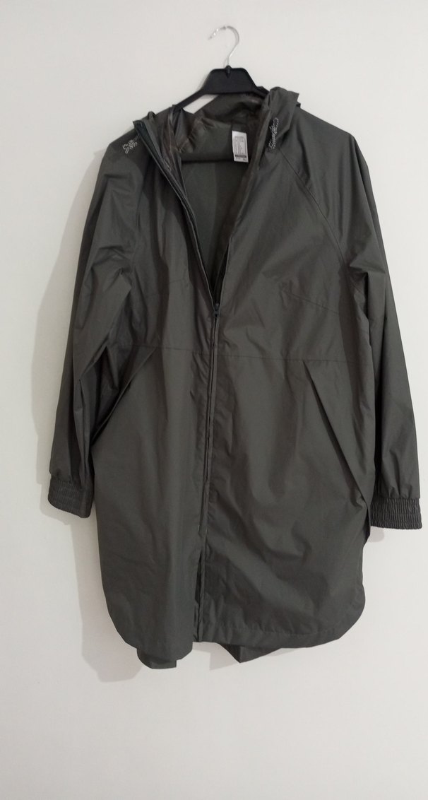 Kadınlar için koyu yeşil renkte, midi boy, yüksek yakalı ve uzun kollu, fermuarlı, bol kesim yağmurluk. Sentetik kumaştan üretilmiş, dış mekan kullanımı için uygun. Decathlon marka hiç kullanılmadı XL beden