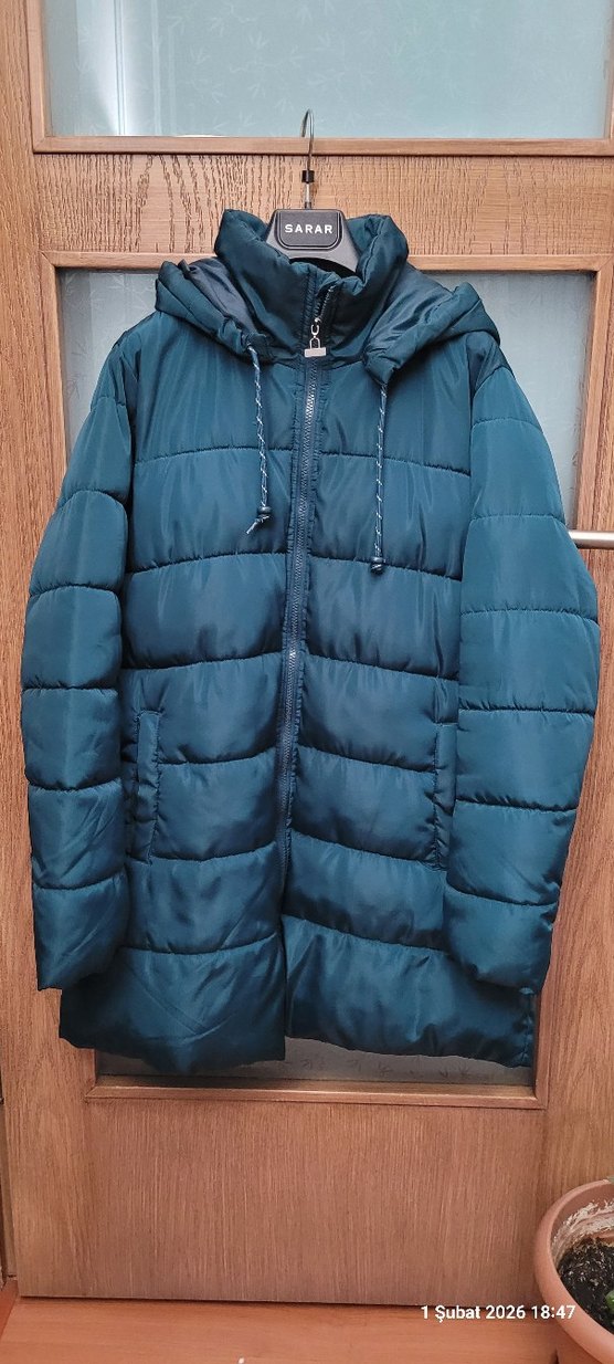 Koyu yesil midi uzunlukta kadın kışlık mont, normal kesim ve fermuarlı öne sahiptir. Rahat yumuşak kumaştan, kapuşonlu, Koton markalı, cok sicak tutan, elyaf dolgulu. ❄️Beden 42.