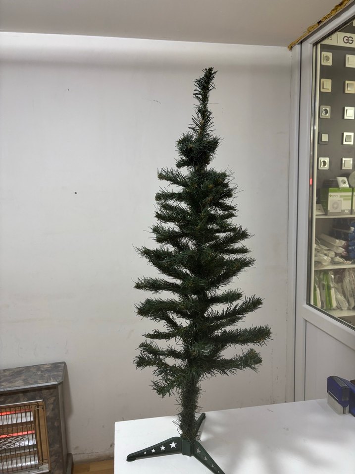 Koyu yeşil renkte, küçük alanlar için uygun, basit ayaklı mini yılbaşı ağacı.