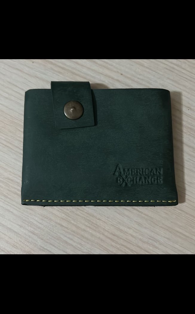 Koyu yeşil renkte, düğmeli kapaklı minimalist kartlık. Üzerinde 'AMERICAN' yazısı kabartma olarak yer alır.