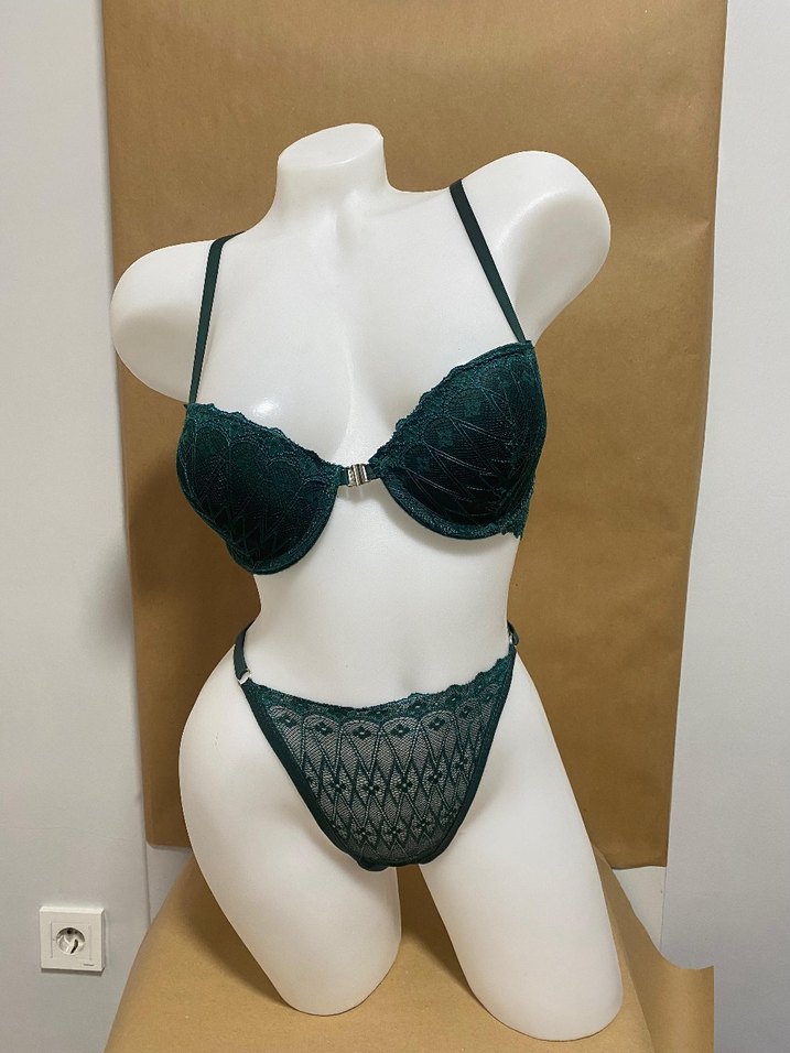 Koyu yeşil, minimal ve gotik tasarımlı sütyen takımı. Dantel detaylı, önden çıtçıtlı ve midi uzunlukta desen içermeyen model. 75/80/85/90 bedenleri mevcuttur.