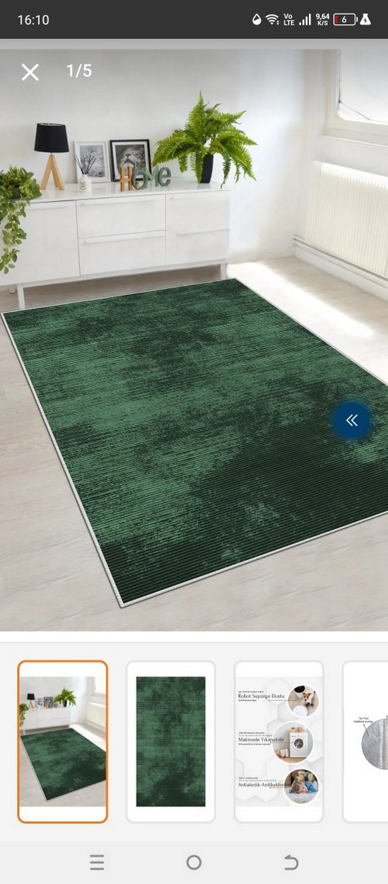 Koyu yeşil renkte, desensiz ve modern tarza sahip bir halıdır. Her mekâna zarif ve sade bir dokunuş katar kaymaz taban dijital baskı muhteşem halı